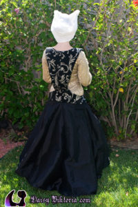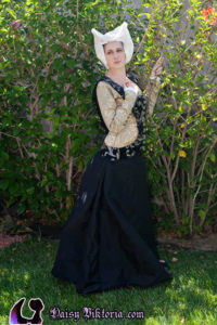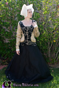The sideless surcote is found across medieval Europe. This version is based on styles popular in France and England in the later part of the 14th century. The top is patterned velveteen, and the bottom is a silk/rayon blend. Here, it is worn over a long-sleeved kirtle with a horned veil headdress.