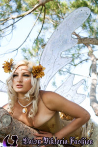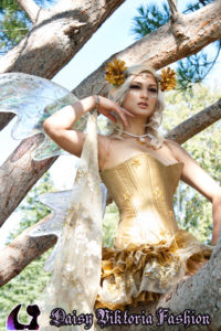 Aurelia the Gold Faerie is shimmering with summer radiance. Her corset gown is made of gold silk, sequined lace, organza, and fairy dust. The wings are coated in resin for a durable finish. She is also wearing a flower circlet and a beaded gem necklace from the Daisy Viktoria accessories collection.