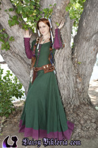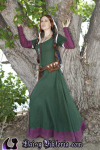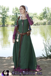 This gown, known as cotehardie, kirtle, cotte, cote, or gothic fitted gown, is based on early 15th century European sources. The dress is made of linen. The buttons are all handmade. The bottom hem features a contrasting fabric that matches the pin-on sleeves, all done with counterchange buttons. The accessories include dried herbs and oils and tinctures I created, all based on period alchemy and arranged on my person with a fun magical touch.