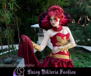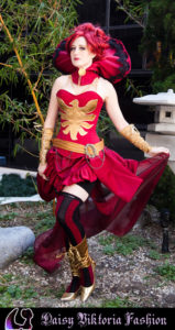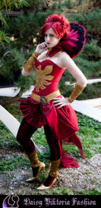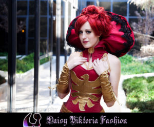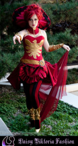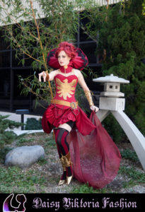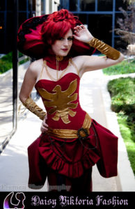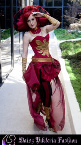 I designed this costume as a steampunk / Victorian fantasy version of Dark Phoenix from X-Men. The corset and collar are rigid, while the skirt incorporates flowing and bustled elements. The stockings, gloves, and boot covers were also made by me.