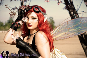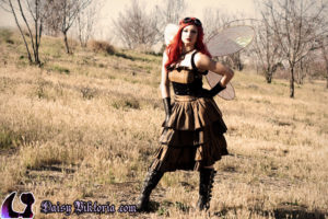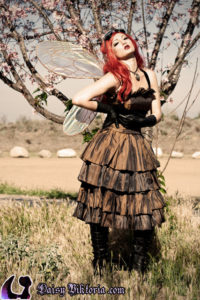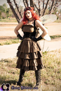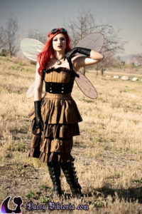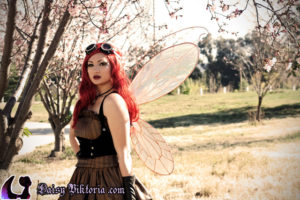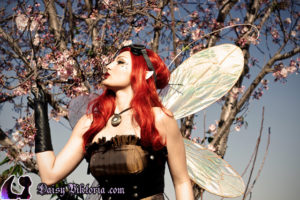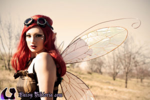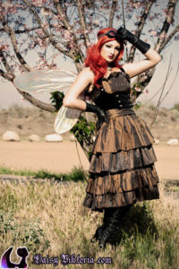This Steampunk Faerie is wearing a ruffled dress and velvet underbust vest, both available in my shop at shop.daisyviktoria.com. The wings are also made by hand with wire, organza, and resin for a tough and durable finish.