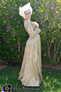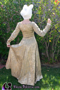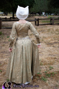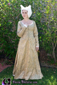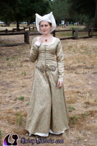 The gored kirtle was a style popular in northern Europe in the 15th century. This kirtle is made of gold brocade/jacquard fabric and laces up in front with buttons on the sleeves. It is often worn as an undergarment with some of my other gowns, but it looks great by itself as well. The hat is a horned veil.