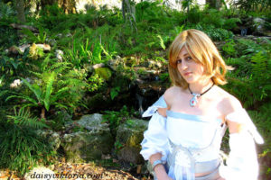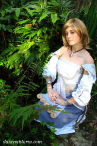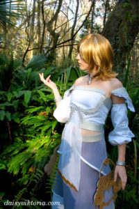This dress is only visible for small periods of time in the game, so I took all available images into consideration in the design of the costume and filled in the missing parts. It consists of three skirt layers, a bodice, sleeves, and various adornments.