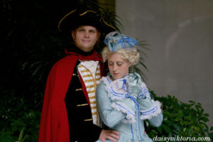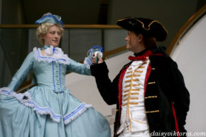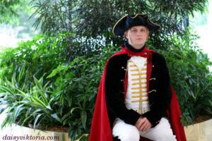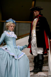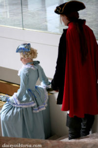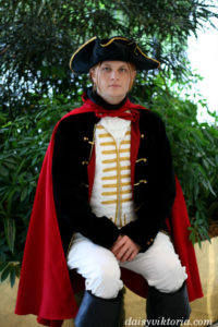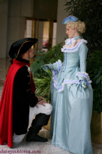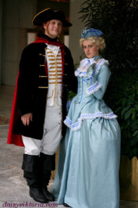 Largely inspired by the designs in the recent movie, this Count Axel von Fersen ensemble was made using extensive historical research. The costume features a frock coat, fall front breeches, a shirt, vest, and tricorn hat. Materials include velvets and silks, as well as cottons and linens.