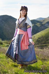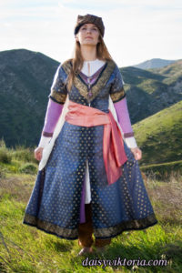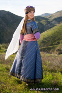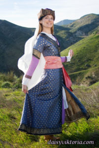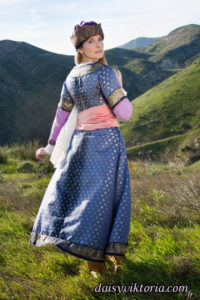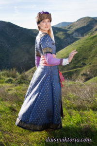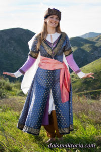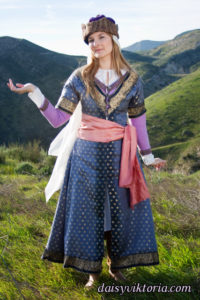 This Persian style is typical throughout several centuries, though I’ve based my design largely on images from around the 15th century. The outer purple layer is made of blue brocade, the next layer is purple linen, and the underdress is white linen. The pants are hand-dyed raw silk with buttons at the cuffs. The sash is also silk. The hat is made of wool and brocade.