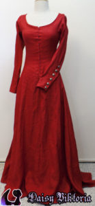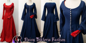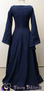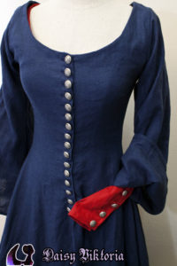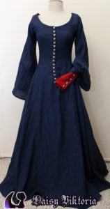 Blue Cotehardie 14th Century Cotehardie This is based on Waterhouse’s painting, Miranda – The Tempest. It is a blue cotehardie with larger sleeves and a red kirtle worn underneath. I have made a couple of these dresses with varying front closure designs. Model: Daisy