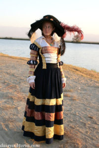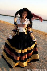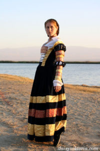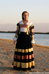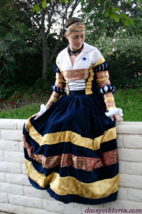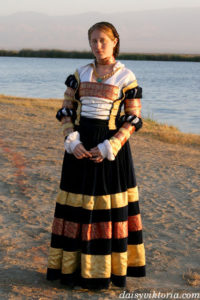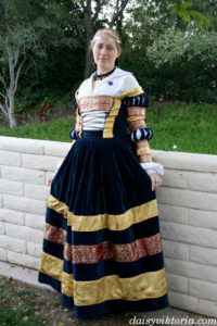 This is 16th century German dress, inspired by the works of Lucas Cranach. The gown is made of deep blue velvet with guards and trim in gold and burgundy brocade. The gown includes: a skirt, bodice, chemise, brustfleck, and a full white brocade camisole/placket beneath the lacings.