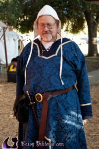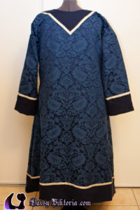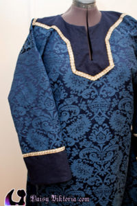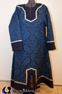 I made this tunic for Master Hroar. The fabric is a beautiful blue damask, and the tunic is constructed as a Viking era tunic with appropriate period patterning. The coif is linen with black embellishment.