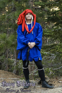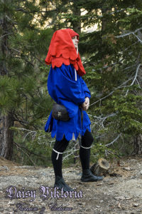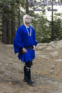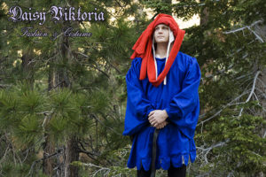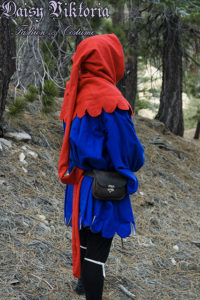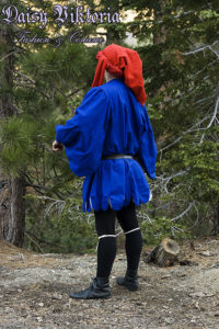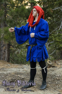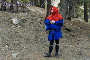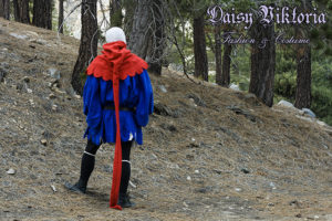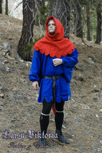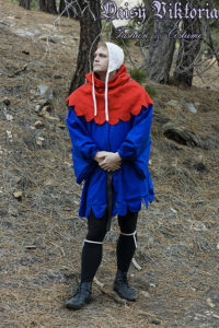 This male houppelande is based on 15th century sources. The houppelande is made of blue wool and fully lined. The hood is made of red wool and is lined throughout the upper section and dagged at the bottom. The hood is also worn rolled up as a chaperone.