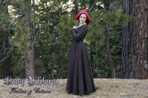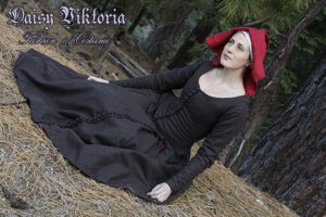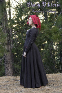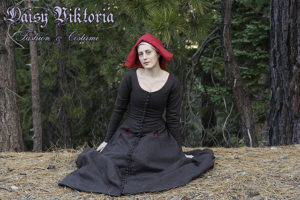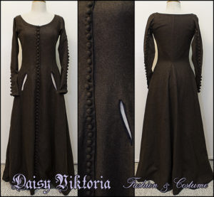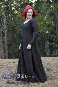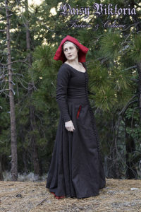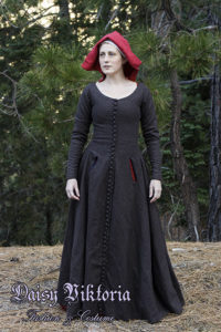 I made this 15th century brown wool gown to stay warm in the winter. The gown is fully lined in linen and features fichets, or pocket slits. The buttons were all made by hand, and the button holes are all hand sewn. The hood is made of red linen.