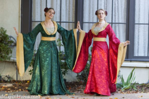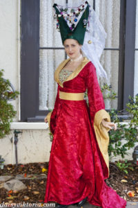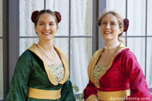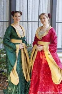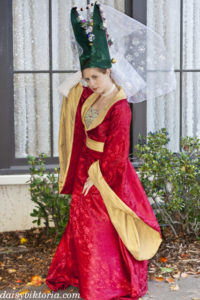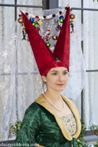 My friend and I made these 15th century outfits for Yule. Our dresses are made of brocade and faux silk, and I made our hats are made in contrasting colors. Just for Yule feast, we decorated our hats with all sorts of festive ornaments and popcorn and cranberry garlands, as well as snowflake print veils.