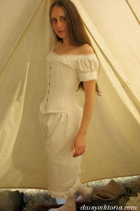 This is a set of women’s Civil War era undergarments. Items constructed include a chemise, drawers, and corset. All are constructed in white cotton materials to reproduce undergarments of the 1860s, and the corset is fully backed. Steel boning completes the look, and the right fit provides comfortable support for all-day wear. Note: I have chosen to upload my sewn-crotch pantaloons for my own modesty on the internet, but I also make crotchless pantaloons.