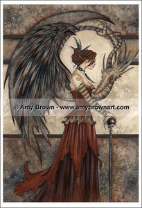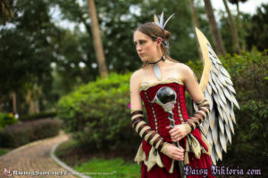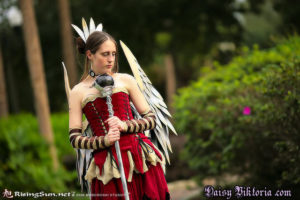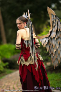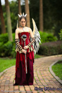 This wonderful image was created by Amy Brown. I’ve been a fan of her work for a long time, and I think she is amazing. The clothing portion of this costume is basically a two layered skirt, a top, sleeves, and a corset, which laces up in 6 places. The staff is made of wood and clay, and the wings are all individually crafted feathers attached to a sturdy frame. They are supported by the corset to look like they originate in my back. The hairpiece and necklace were made in a similar manner with individual feathers attached to their respective pieces.