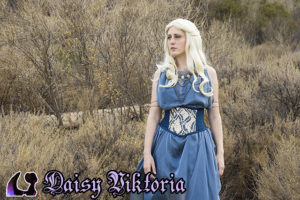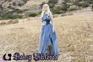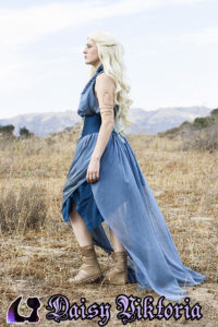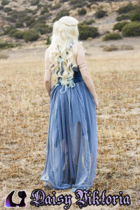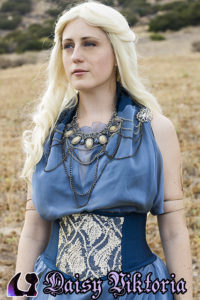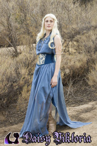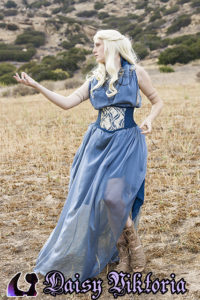 I love Daenerys Targaryen (Stormborn) from A Song of Ice and Fire. I wanted to capture her character while designing my own version of her clothing. I used an elegant blue chiffon and created a waist cincher to go with it. I also created an intricate necklace to go with the gown.