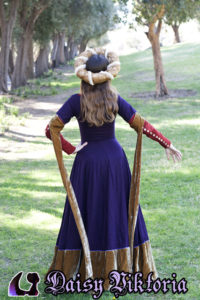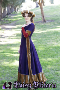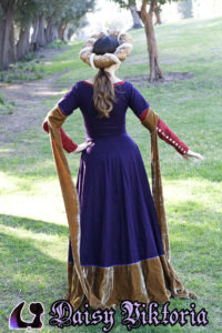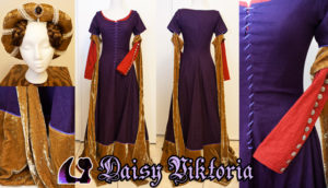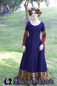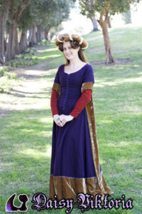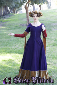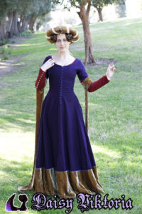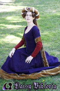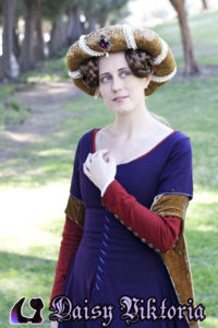 This gown is based on early 15th century sources. The outer layer is made of linen with silk velvet trim and tippets. Hand woven cord has been couched on the edges and is also used for the front lacing. The gown is worn over another layer of red linen, as well as a white under dress. The hat is accented with a gem in front.
