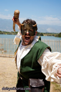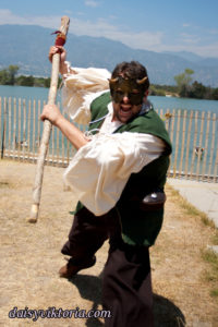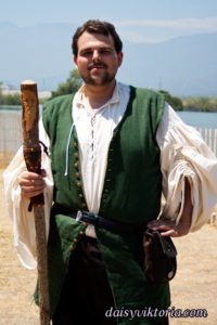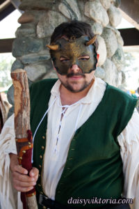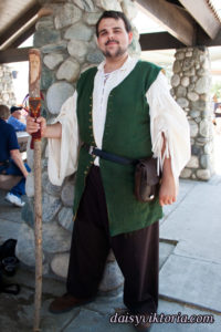 This costume was made for a character who wished to adventure around the Renn Faire. He is wearing standard medieval men’s pants in brown with a drawstring waist, a modified Renaissance style muslin shirt with adjustable sleeves, and a green and gold vest with tattered edges.