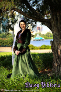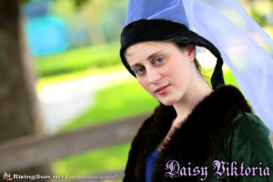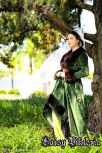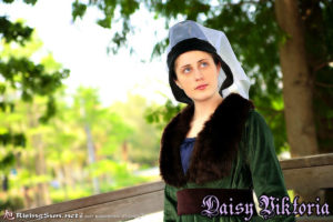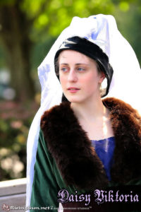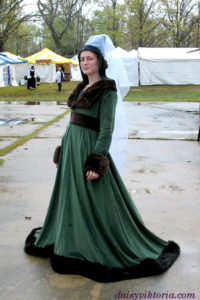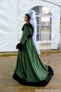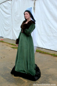 This is a court dress from 15th century Burgundy. It is worn over a kirtle and chemise, and the outfit includes the dress, belt, placket, and hennin. The dress is made of velveteen fabric with fur trim, and the underclothes are linen. The hat is a truncated henin, and the shape is supported with buckram and wire.