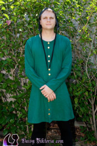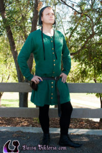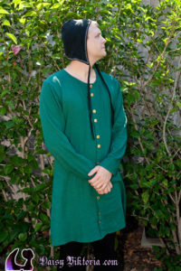 The cotte was worn in northern Europe in the middle ages. This one is based on 14th century examples from France. It is made of linen with golden buttons. Here it is also worn with black tights and a black linen embroidered coif.