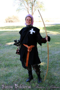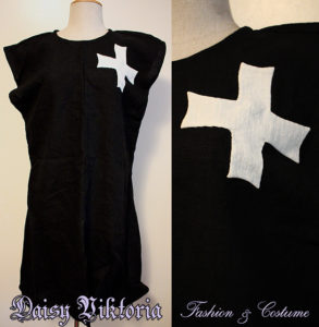 I created this tabard to wear as a confrater in the order of the Hospitallers of St. John in my medieval reenactment group. The construction is a basic medieval rectangular cut with a hand stitched cross above the heart.