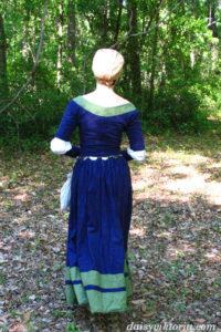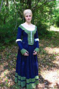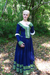 This is a style from 16th century Germany, worn by the kampfrau. It is made of linen, with contrasting colored guards and trim. The skirt is cartidge pleated onto the waistband, and the bodice closes in the front. This variation includes a chemise with a low neckline.