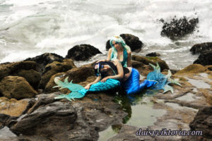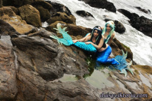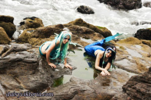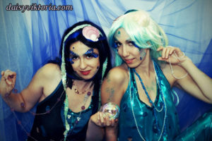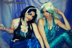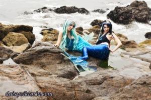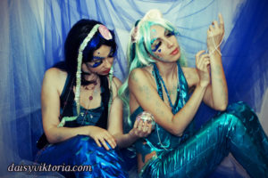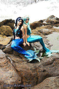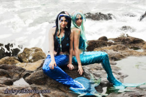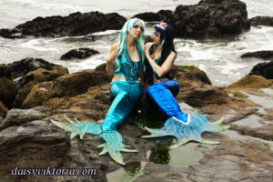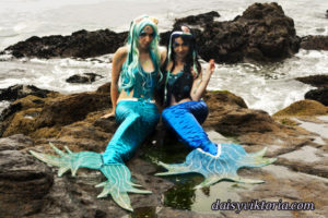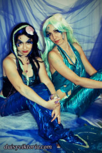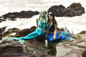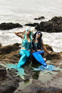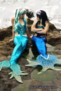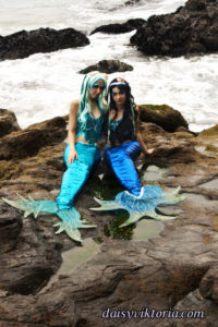Mermaid Sisters Mermaid Sisters The mermaid sisters each have a handmade mystical fin and mer-tail. The tops are halters, a different take than the usual seashell bra. Models: Mona Weiss, Lauren Brooks Photographer: Chris Taylor