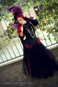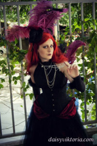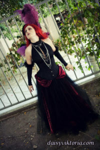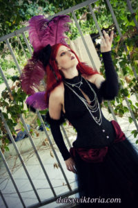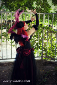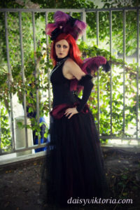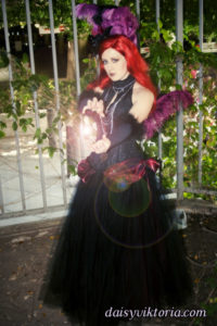 Morgana is a dark sorceress. She is styled with lots of feathers and bling necklaces, which I also made – the necklaces, that is…the feathers were made by black and purple and red ostriches, of course.