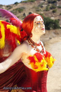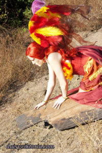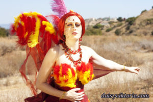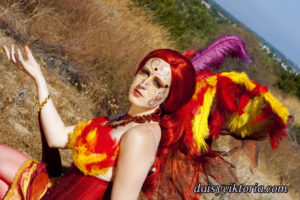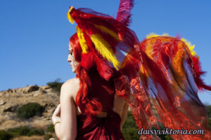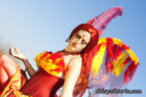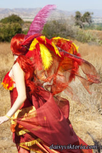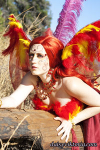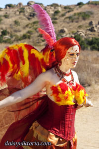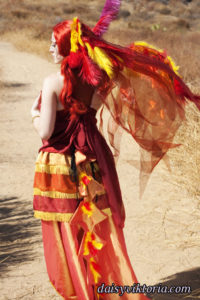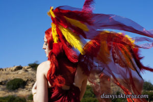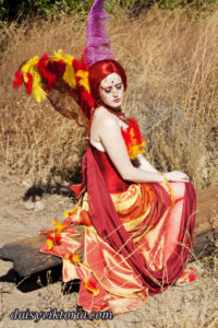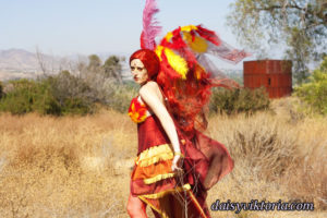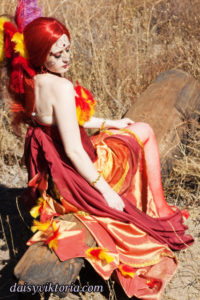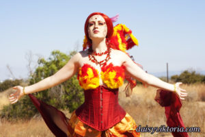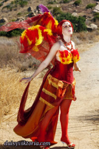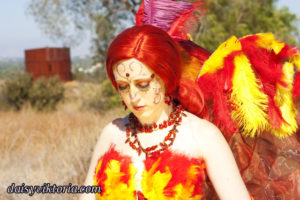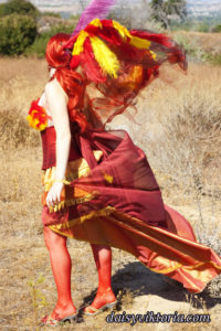 This is my Phoenix design. The Phoenix embodies the spirit of fire as she rises from the ashes. The costume incorporates flowing materials to give an ethereal firey feeling and feathers to simulate the bird spirit.