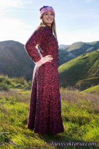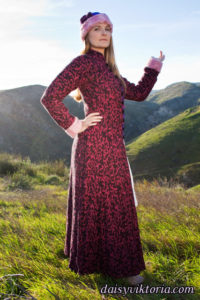 This Persian style is typical throughout several centuries, though I’ve based my design largely on images from around the 15th century. The coat and hat are both made from a fun pink with black swirls, along with a purple wool and pink textured faux fur.