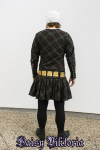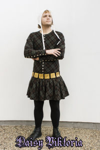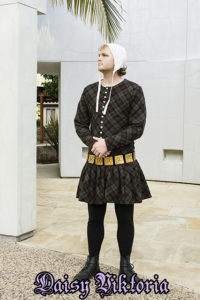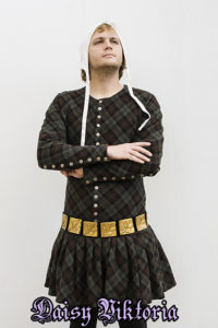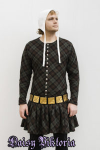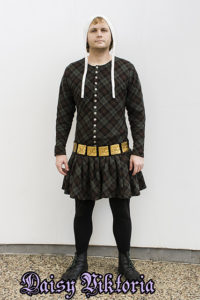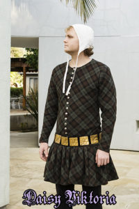 Plaid Cotehardie Plaid Cotehardie With Frounced Skirt This is a late 14th century style plaid cotehardie with a frounced, or pleated / gathered, skirt. The cote buttons up the front and halfway up the sleeves. I also made the linen coif and the placket belt. Model: Chris Photographer: Daisy