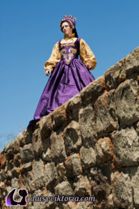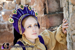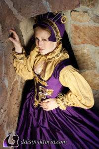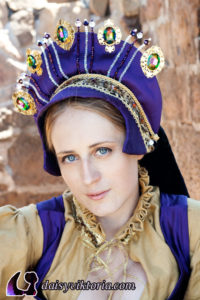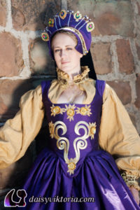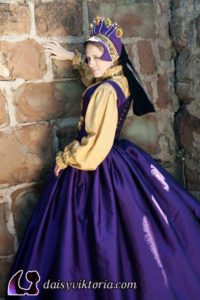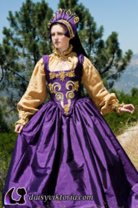 This is based on early Elizabethan fashion with a fantasy twist. The gown is made of purple silk with gold applique on the bodice and a cartidge pleated skirt. The smock is gold linen with beaded trim. The French Hood is silk and velvet with beads and gemstones for a very elaborate look. The gown is worn over a farthingale and corset.