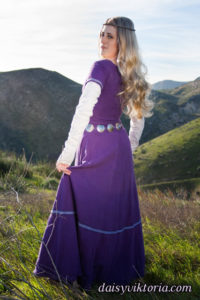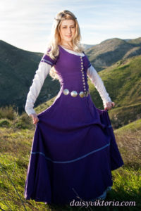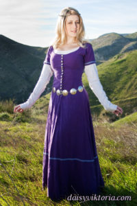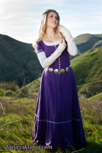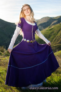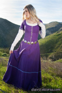 This is a cotehardie, a style popular in 14th century France. This is a fitted dress that buttons up the front with gores in the skirt, and it is worn over a white linen underdress. These buttons were hand made by sandcasting.
