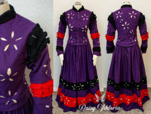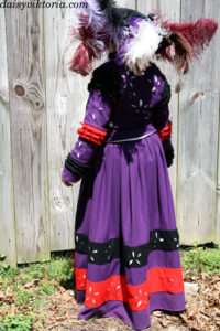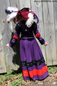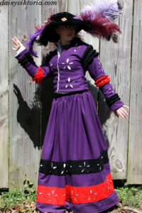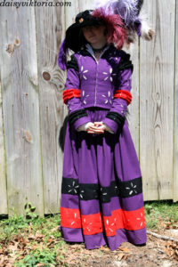 This is 16th century German Landsknecht dress. It is made mostly of wool, with contrasting colored guards and lots of puff and slash details. The hat is a velvet flat cap decorated with ostrich feathers.