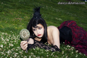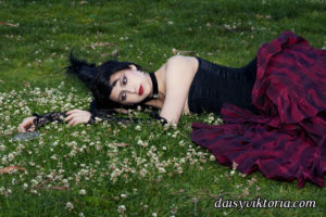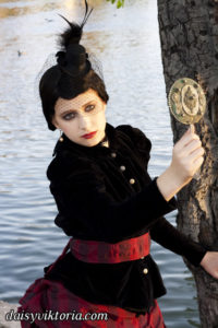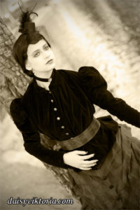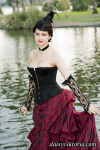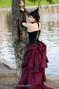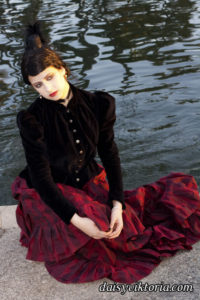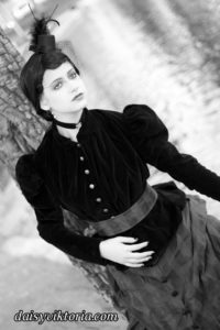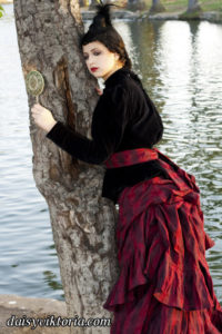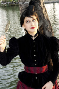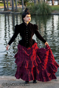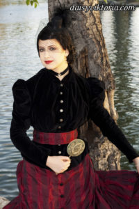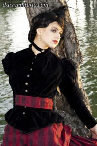 This ensemble is patterned after existing garments from the 1880s. The bustle skirt and belt are made of matching fabric, and the jacket is velvet lined in linen. The corset is made of black satin and lace and fully supported with steel boning. Wearing the corset alone as in some photos is not period, but I also love a good period-inspired gothic look.