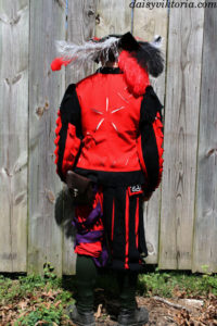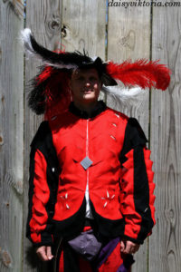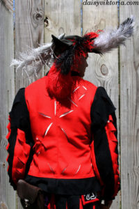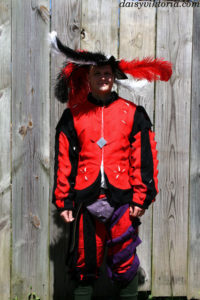 This is 16th century German Landsknecht outfit. It is made mostly of wool, with some linen and lots of puff and slash details. The hat is a velvet flat cap decorated with large feathers.