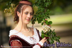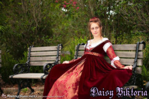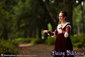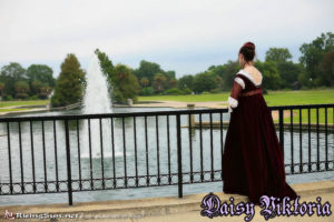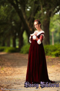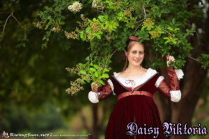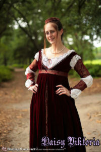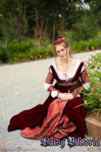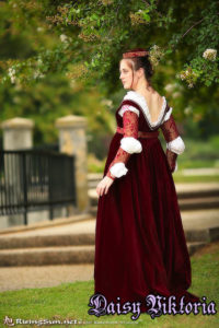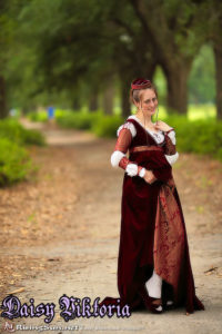 This is based on images from the late 15th century in Venice. The chemise is made of white linen with a tie in the front, and the underdress is a brocade that imitates the prints of the period. The overdress is made of velvet with beading along the neckline. The stockings were made from scrap material I had around. The shoes, in substitution of real chopines, are a pair of sandals I found and modified, then covered with material. The hat was made to imitate the one in the Durer image.