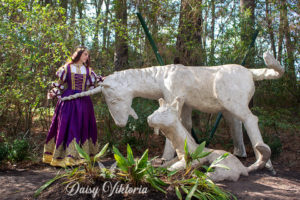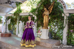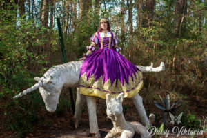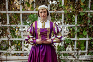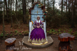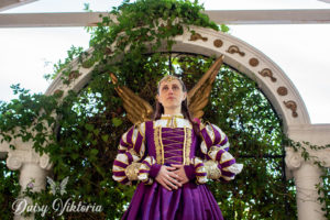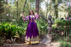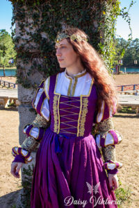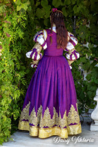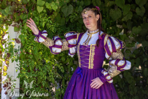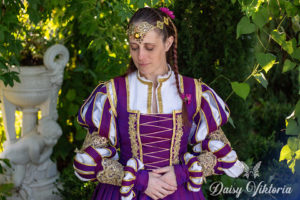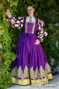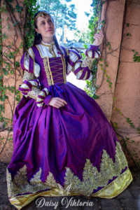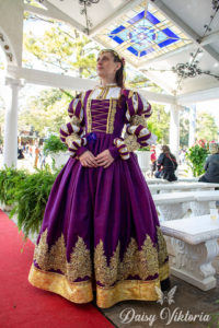 Inspired by 16th century German fashion, and a bit of more fantastical fairytale element, this gown is made of blue and pink two tone dupioni silk, with various beaded and sequined gold trims and gold floral brocade.