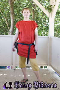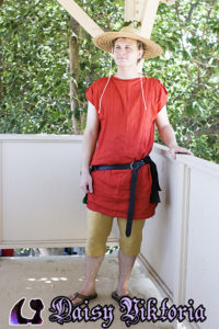 This outfit is based on ancient Roman clothing worn by workers. The tunica and pants are made of linen, and the tunica features leaf brooches. Pants were considered barbaric, but they are great for everyday wear.