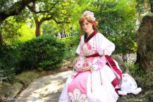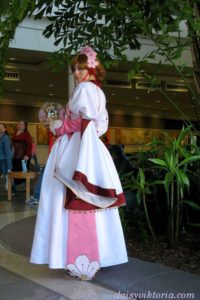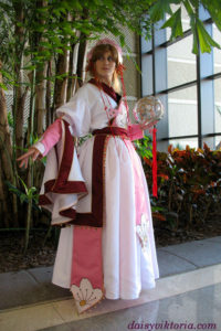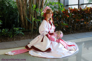 This costume has multiple skirt layers, and all the white was lined to mimic the pinkish tint seen in the white material in the image. All the piping was made by hand, and the flowers were embroidered by hand. There are many bells on the belt pieces, which were each attached individually.