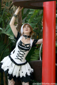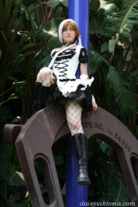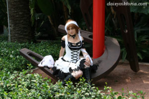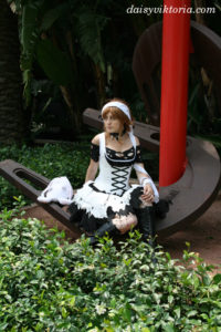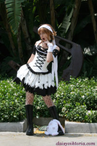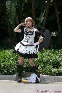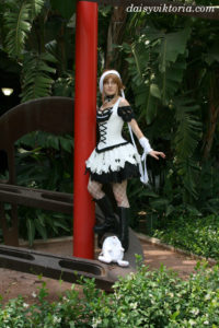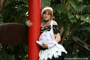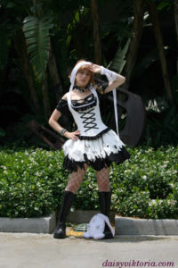 This costume was a lot of fun to make! The top is a corset with cute decorations and is quite supportive. The shirt and the skirt were both cut up and ripped to create the effect seen in the image. I also constructed the necklace and the long bandage and the Mokona, which I’ve taken along with all of my Sakura costumes.