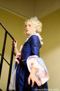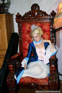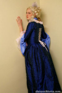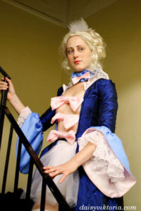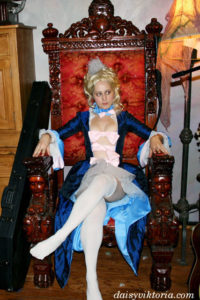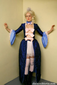 This is my version of “Sexy” Marie Antoinette. Rather than doing a Marie-inspired modern dress, I based it on Marie’s historical gowns and then altered the design, leaving out certain pieces. The dress is made of faux silks and satins with lace accents.