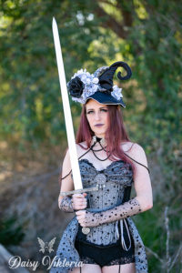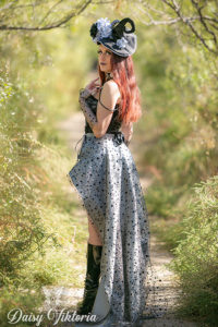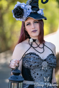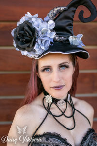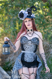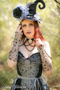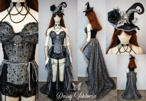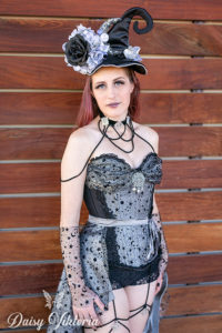 Silver Moon Witch Silver Moon Witch Original design inspired by some witchy fun! The corset is made of black dupioni silk, silver grey silk, and celestial moon netting. The skirt is made of the same fabrics, and the hat and accessories coordinate with fun embellishments. Model: Daisy Photographer: Darren Leigh