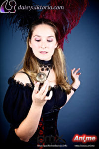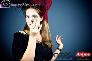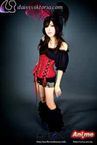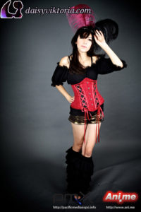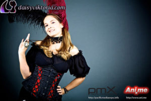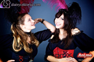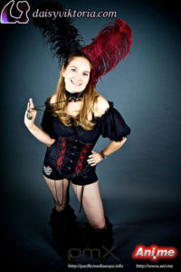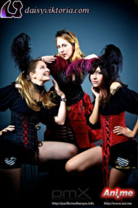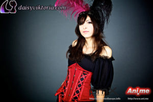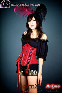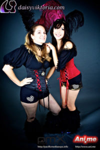 I designed and created these steampunk babe costumes for my promotional models at events. They’re both wearing underbust Miranda corsets, ruffled leg warmers, spandex heart shorts, and short sleeve maiden blouses, all available at shop.daisyviktoria.com.
