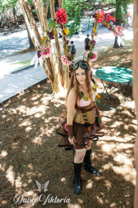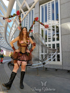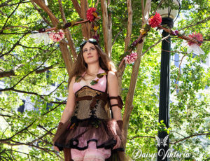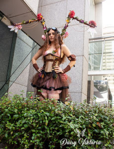 I created this steampunk faerie costume as a super cool original design! The corset features a scale pattern, to encompass a bit of dragon-like influence. The wings are my own imagining of a mechanical concept, with visible pipes and wires decorated with flowers and leaves. The wings are retractable and may be worn both open and closed.