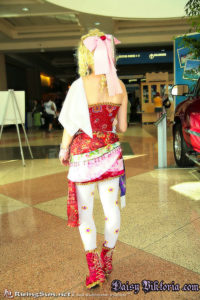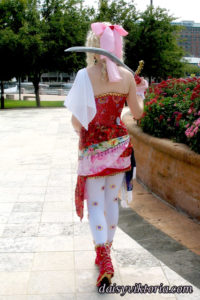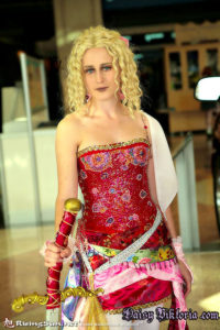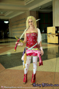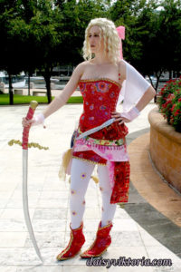 I intended for this costume to have a bit more of a presence than my previous Terra costumes. I went with beading and glitz to give it more of a stage wear look. The entire bodice is covered in sequins and beads. The tights and cape are also sequined and beaded. The sword is hand-made and intended to accompany all three of my Terra costumes up to this point.