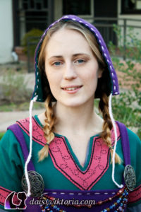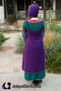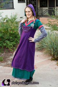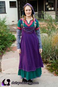 There are three layers in this Viking ensemble, the under tunic, the tunic, and the apron dress. The undertunic is linen, and the rest is all wool. The tunic features hand embroidered accents along the neckline and sleeves. The apron dress and the coif are also accented in simple embroidery.