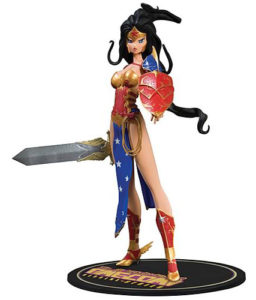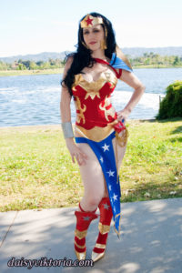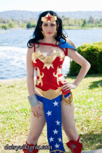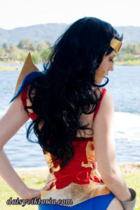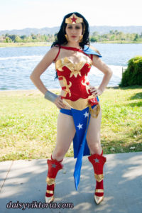 Wonder Woman Ame Comi Wonder Woman This is the Ame Comi figurine version of Wonder Woman. The corset buckles on the sides, and the designs are appliqued in metallic gold fabric. The accessories are made primarily of foam. Model: Daisy Photographer: Chris Taylor