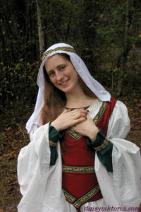 This was my Yule garb, done in the bliaut style with holiday-esque trim. The dress is a 12th century French style. The undermost layer is a green t-tunic patterned dress. The bliaut laces on the sides and has a full skirt, which is attached to the bodice as a separate piece. The sleeves are gathered into the trim to create the puffyness. This is actually my old bliaut but modified to include a keyhole neckline with gold trim. The corsage, an early type of corset, laces in the back. This one is made of red silk.