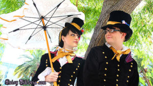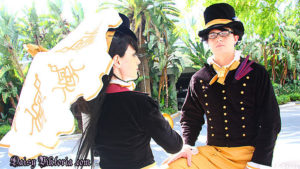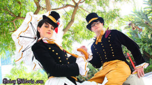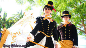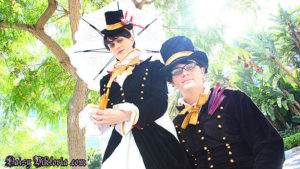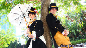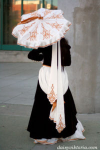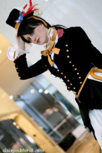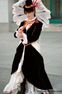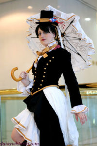 Yuuko’s dress from Volume 5 of xxxHolic was made in the style of a modernized version of Vicotian riding garb. The parasol was made using the structure of an existing umbrella, and all designs were drawn by hands and appliqued on.